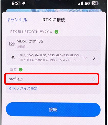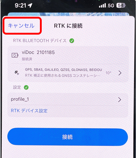 「RTKに接続」画面を一度「キャンセル」で閉じ、再度「RTKに接続」画面に入り直してみる。