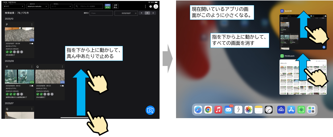一度、Smart Construction Quick3D アプリ、Pix4D catchアプリを終了(タスクキル)し、再度 起動する。
